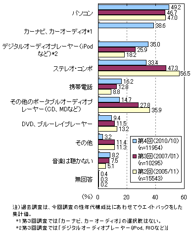 「パソコン」(49.2%)が最も多く、「カーナビ、カーオーディオ」「デジタルオーディオプレーヤー」「ステレオ・コンポ」が各3~4割で続きます。2007年よりも「ステレオ・コンポ」「その他のポータブルオーディオプレーヤー」が減少、「デジタルオーディオプレーヤー」が増加しています。
