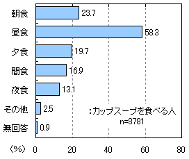 カップスープを「昼食」に食べる人が、カップスープを食べる人の58.3%にのぼります。女性では7割近く、男性を大きく上回ります。10・20代は「間食」が多い傾向です。