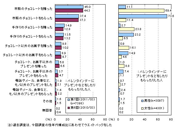 「市販のチョコレートを贈った」(45.0%)は、男性11.1%、女性69.4%、「市販のチョコレートをもらった」(37.4%)は男性73.6%、女性11.4%です。