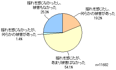 東日本大震災の揺れ・被害状況は「揺れを感じたし、何らかの被害があった」が19.2%、「揺れを感じたが、あまり被害はなかった」が54.1%で、揺れを感じたという人は4分の3程度を占めます。