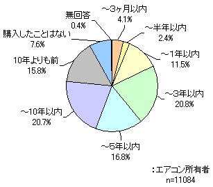 エアコン所有者のうち直近1年以内購入者は18.0%です。「~3ヶ月以内」は4.1%です。