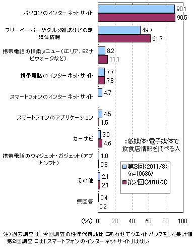 飲食店情報を調べる際の情報源は「パソコンのインターネットサイト」(90.1%)の他、「フリーペーパーやグルメ雑誌などの紙媒体情報」(49.7%)が多くなっています。「携帯電話の検索メニュー」「携帯電話のインターネットサイト」が各1割弱です。
