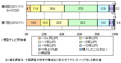 〔(薄型テレビをお持ちの方)あなたのご家庭でお使いの薄型テレビを購入した時期をお聞かせください。2台以上お持ちの場合は直近で購入したものについてお聞かせください〕