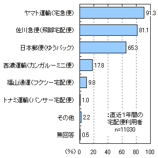 直近1年間に利用した宅配便サービスは「ヤマト運輸(宅急便)」(91.3%)、「佐川急便(飛脚宅配便)」(81.1%)、「日本郵便(ゆうパック)」(65.3%)などが上位にあがっています。