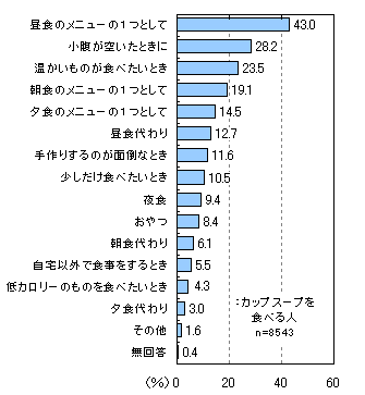 カップスープを食べるシーンは「昼食のメニューの1つとして」が最も多く、「小腹が空いたときに」「温かいものが食べたいとき」などが続きます。