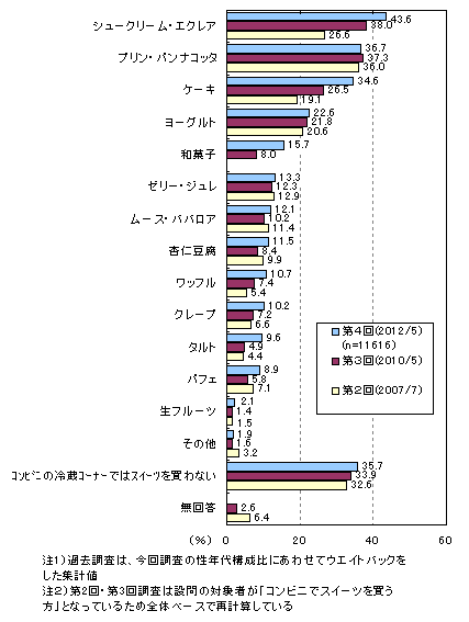 コンビニの冷蔵コーナーのスイーツを購入する人は64.3%です。男性は5割強、女性は7割強で、女性の方が多くなっています。男性では30代の購入者が他の年代より多くなっています。