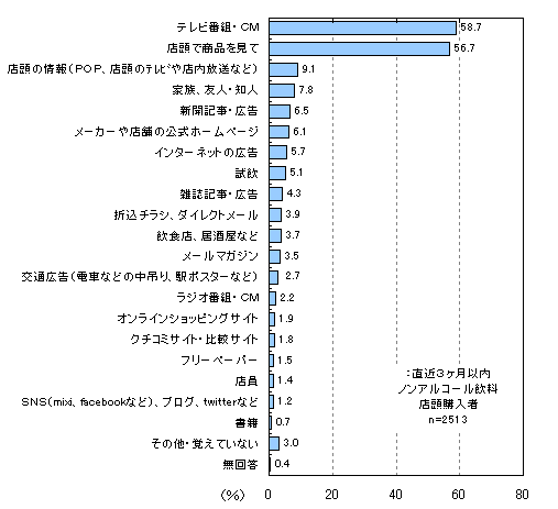 〔(直近3ヶ月間にノンアルコール飲料を店頭で購入した方)あなたは、直近で購入したノンアルコール飲料の商品は、どこで知りましたか(複数回答可)〕