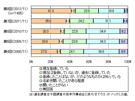 SNSに「現在登録している」(41.3%)、「現在は登録していないが、過去に登録していた」(4.5%)をあわせ、登録経験者は45.8%です。過去調査と比べて増加傾向にあります。認知率は96.5%を占めます。