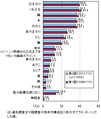 男性10代、女性10・20代は「くちびる」、男性20~40代と女性30代は「口まわり」、男性50代以上は「脚」、女性40代以上は「かかと」が最も多くなっています。