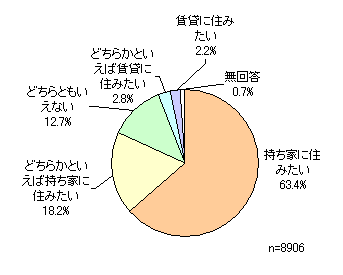 「持ち家に住みたい」が63.4%と、全体の約3分の2を占めます。「どちらかといえば持ち家に住みたい」をあわせ、持ち家に住みたい人は81.6%です。