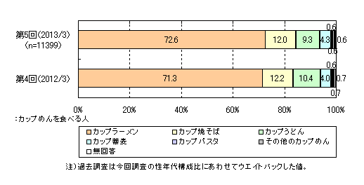 最もよく食べるカップめんのタイプは「カップラーメン」が72.6%で、「カップ焼そば」「カップうどん」が各1割前後となっています。