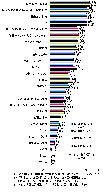 マンション購入経験者・意向者の重視点は「最寄駅からの距離」「生活環境の利便性」「日当たり・採光」「間取り」が各6~7割で、上位にあがっています。