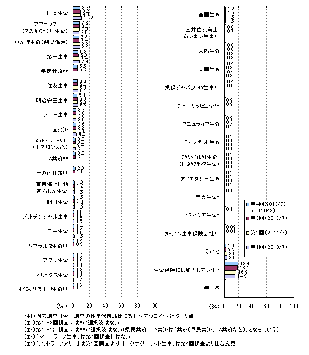 加入者が多いのは「日本生命」「アフラック」「かんぽ生命」「第一生命」などで、各1割弱です。