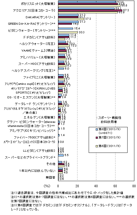 直近1年以内に飲んだスポーツ・機能性飲料は「アクエリアス」「ポカリスエット」が各6割でトップ2です。以下「DAKARA」「GREEN DA・KA・RA」「ビタミンウォーター」などが各2割前後で続きます。