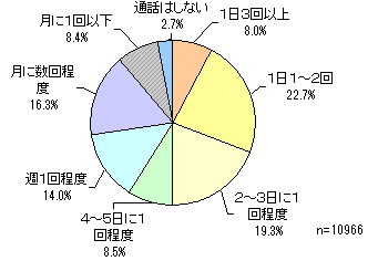 通話頻度は「1日1~2回」「2~3日に1回程度」が各2割、「月に数回程度」が2割弱となっています。男性や、高年代層では、頻度が高い人が多くなっています。