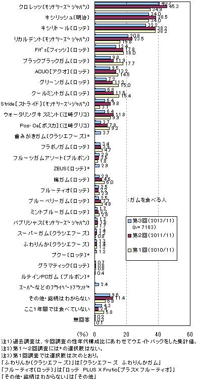〔(ガムを食べる方)あなたが直近1年以内に食べたガムのうち、最もよく食べたものを1つお聞かせください〕