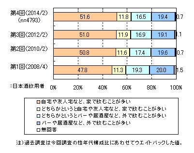 〔(日本酒を飲む方)あなたは普段、日本酒をどちらで飲むことが多いですか。〕