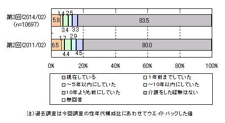 介護経験がある人は16.5%です。「現在している」が5.8%、過去にしたことがある人が10.6%となっています。