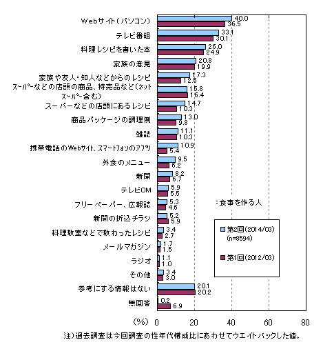 食事を作る人が、メニューを考えるときに参考にする情報は、「Webサイト(パソコン)」「テレビ番組」「料理レシピを書いた本」「家族の意見」「家族や友人・知人などからのレシピ」「スーパーなどの店頭の商品、特売品など(ネットスーパー含む)」などが上位にあがっています。