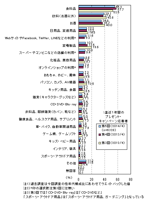 直近1年間に応募したプレゼント・キャンペーンの対象商品・サービスは「食料品」「飲料(お酒以外)」「お酒」などが各4~6割で上位です。