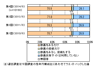 動画共有サイト利用者は73.9%です。「動画をみるだけ」は70.9%で、「動画をみるし、投稿もする」(2.5%)をあわせた閲覧者は73.4%です。一方、投稿者は3.0%となっています。