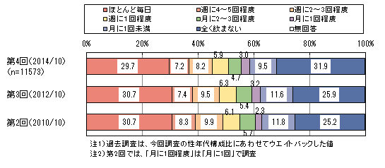 インスタントコーヒーを飲む人は7割弱です。「ほとんど毎日」が29.7%で、週1回以上飲用者は半数強です。2012年調査より飲用者は減少しています。