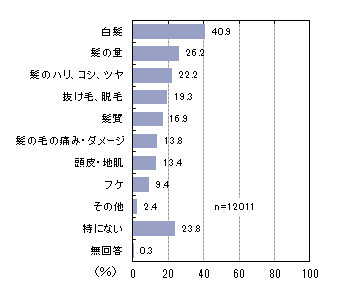 全体の1位は「白髪」(40.9%)で、「髪の量」「髪のハリ、コシ、ツヤ」「抜け毛、脱毛」などが続きます。