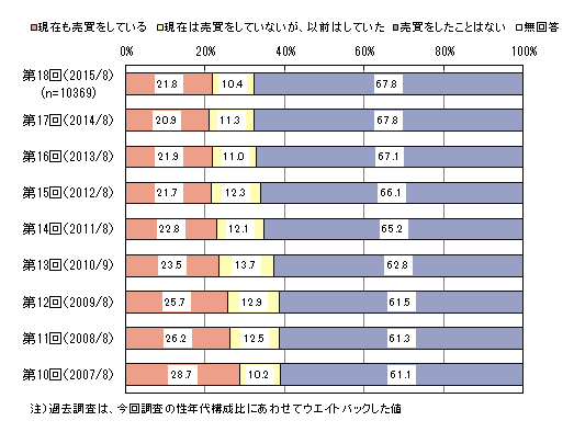 株式売買の経験率は「現在も売買をしている」「現在は売買をしていないが、以前はしていた」を合わせ、32.2%です。