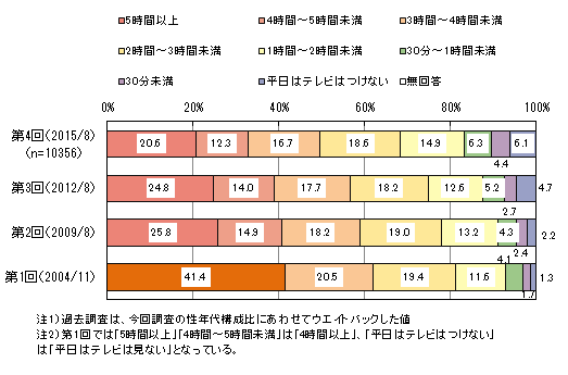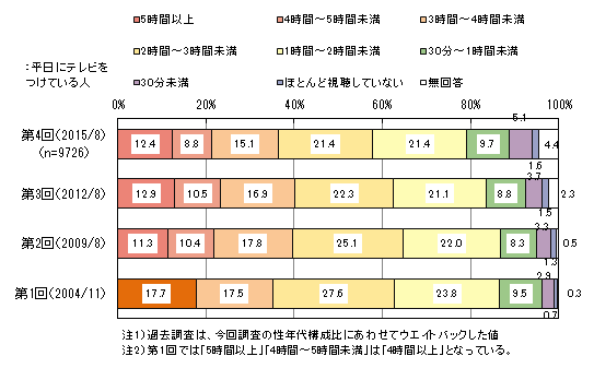平日にテレビを3時間以上つけている人は5割弱です。過去調査と比べ、平日にテレビをつけている時間が短い人が増加している傾向がみられます。「平日はテレビはつけない」は6.1%で、過去調査より増加傾向です。