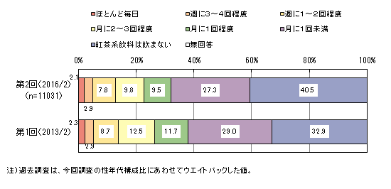 〔(全員)あなたは市販の紅茶系飲料をどのくらいの頻度で飲みますか。※ペットボトル、缶、紙パック入りのものについてお答えください。テイクアウトや紙コップの自動販売機、ティーバッグなどは含みません〕