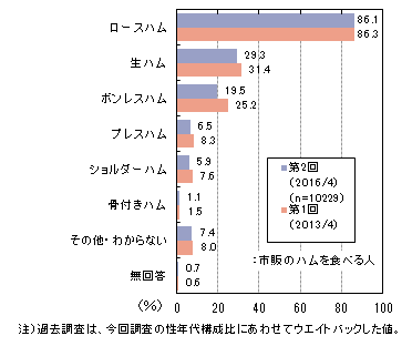 食べるハムの種類は「ロースハム」が86.1%、「生ハム」「ボンレスハム」が各2~3割となっています。