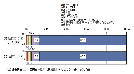 〔(全員)あなたは、定額制音楽配信サービスを利用していますか。直近1年間に利用した頻度をお聞かせください。※定額制音楽配信サービス:月額料金を払い、ストリーミング再生で音楽を聴き放題〕