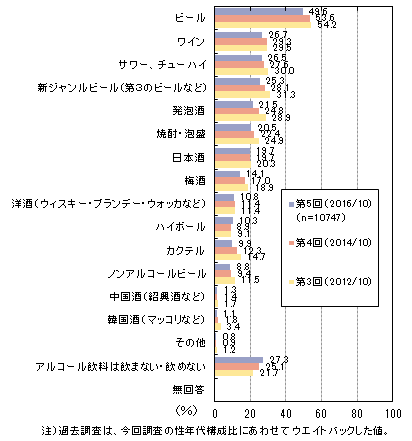 〔(アルコール飲料を飲む方)あなたが最もよく飲むアルコール飲料の種類はどれですか。(ノンアルコールビールも含む)〕