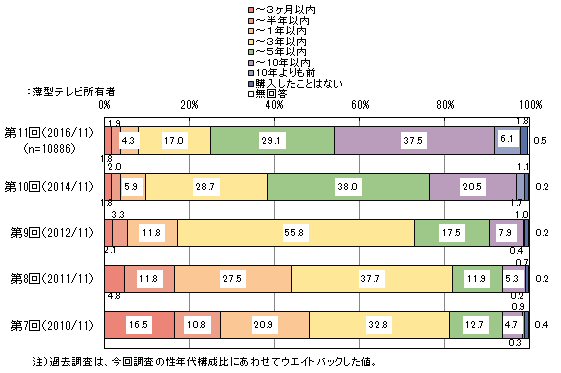 薄型テレビ購入時期は、「~5年以内」「~10年以内」が各3~4割でボリュームゾーンです。