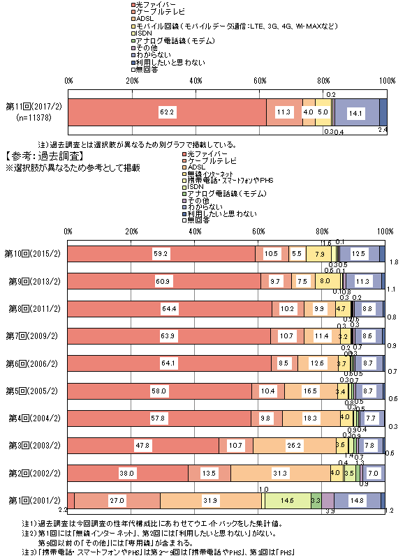 〔(全員)現在ご自宅で主に利用しているインターネット回線は何ですか。1つお選びください。〕