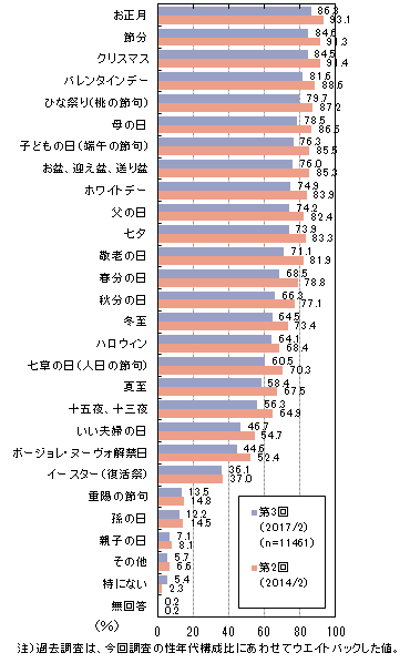 季節行事・記念日等の認知率は、上位4位は80%台です。「重陽の節句」「孫の日」「親子の日」は各1割と、低くなっています。「イースター(復活祭)」「ボージョレ・ヌーヴォ解禁日」「いい夫婦の日」は各4~5割です。