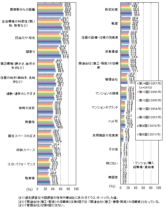 マンション購入経験者・意向者の重視点は、「最寄駅からの距離」「生活環境の利便性(買い物、教育など)」「日当たり・採光」「間取り」が各6~7割で、上位にあがっています。