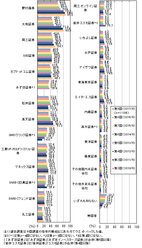 証券会社の認知率は「野村證券」(61.2%)が最も高く、「大和証券」「岡三証券」「SBI証券」「カブドットコム証券」などが各4割で続きます。