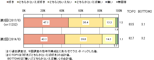 中華料理が好きな人(「好き」「どちらかといえば好き」の合計)は83.5%です。