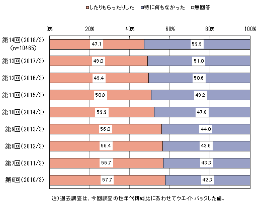 「したりもらったりした」は女性の方が比率が高く、女性10~30代では各6割です。一方、60・70代では4割、男性20代では3割強と、低くなっています。