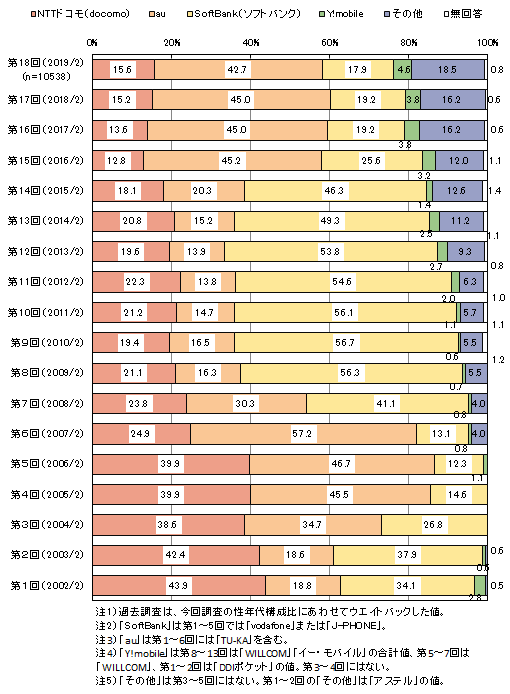 最もCMの印象がよいと思う携帯電話会社は「au」が42.7%、「SoftBank」が17.9%、「NTTドコモ」が15.6%です。2016年以降、「au」が半数近くを占めています。「その他」が18.5%で、過去調査と比べ増加しています。