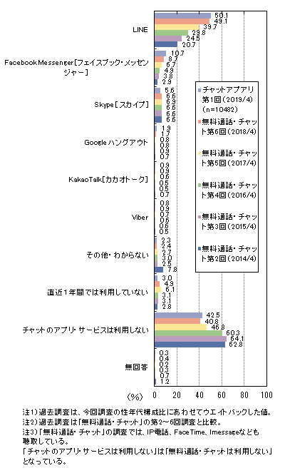 「LINE」は全体の50.1%で、過去調査と比べ増加傾向です。男性10・20代や女性10~30代で7~9割、60・70代では30%台と、年代差が大きくなっています。