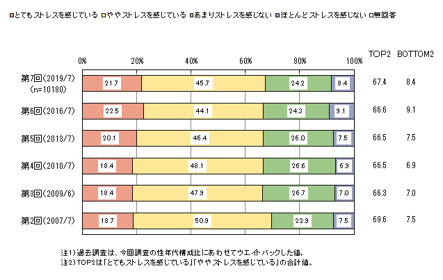 ストレスを感じている人(「とてもストレスを感じている」「ややストレスを感じている」の合計)は7割弱です。