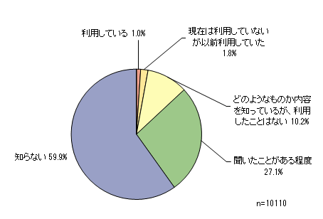 完全栄養食を「利用している」は1.0%、「現在は利用していないが以前利用していた」は1.8%で、これらをあわせた利用経験者は約3%です。これに「どのようなものか内容を知っているが、利用したことはない」「聞いたことがある程度」をあわせた認知率は、全体の40.1%です。