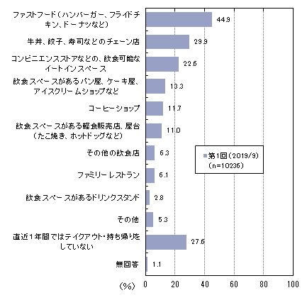 直近1年間にテイクアウト・持ち帰りをした人は、全体の7割強です。「ファストフード(ハンバーガー、フライドチキン、ドーナツなど)」が44.9%、「牛丼、餃子、寿司などのチェーン店」「コンビニエンスストアなどの、飲食可能なイートインスペース」が各2~3割となっています。