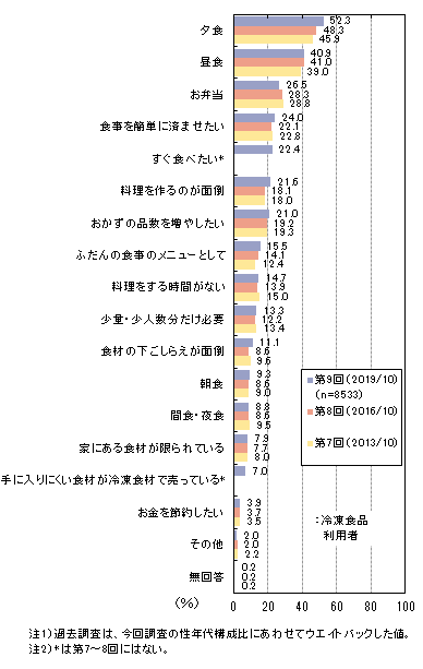 〔(冷凍食品を利用する方)あなたは、冷凍食品をどのようなときに利用しますか。(冷凍野菜・肉・魚等の冷凍素材も含む)(複数回答可)〕