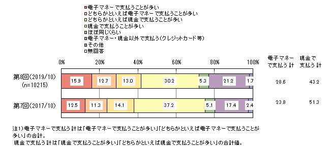 店頭で非接触型電子マネーで支払うことが多い人(「電子マネーで支払うことが多い」「どちらかといえば電子マネーで支払うことが多い」の合計)は3割弱です。現金で支払うことが多い人(「現金で支払うことが多い」「どちらかといえば現金で支払うことが多い」の合計)は4割強で、2017年調査よりやや減少しています。「電子マネー・現金以外で支払う(クレジットカード等)」は2割強となっています。