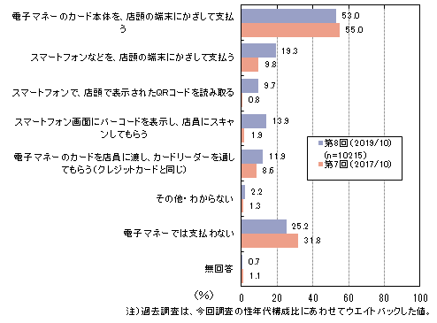 店頭で電子マネーで支払う人は全体の7割強です。「電子マネーのカード本体を、店頭の端末にかざして支払う」は全体の53.0%です。「スマートフォンなどを、店頭の端末にかざして支払う」は19.3%、「スマートフォン画面にバーコードを表示し、店員にスキャンしてもらう」「スマートフォンで、店頭で表示されたQRコードを読み取る」などは各1割前後で、2017年調査より増加しています。