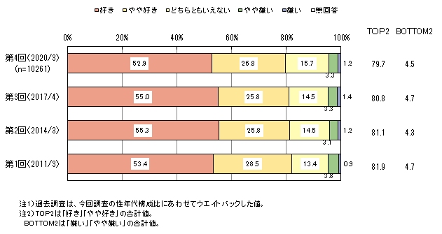 野菜が「好き」は52.9%、「やや好き」は26.8%で、これらを合わせ8割弱が野菜が好きであるという回答です。