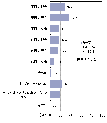 同居者がいる人のうち、自宅でひとりで食事をする場面は「平日の昼食」が35.9%、「平日の朝食」が28.6%です。「特に決まっていない」「自宅ではひとりで食事をすることはない」も各2割みられます。